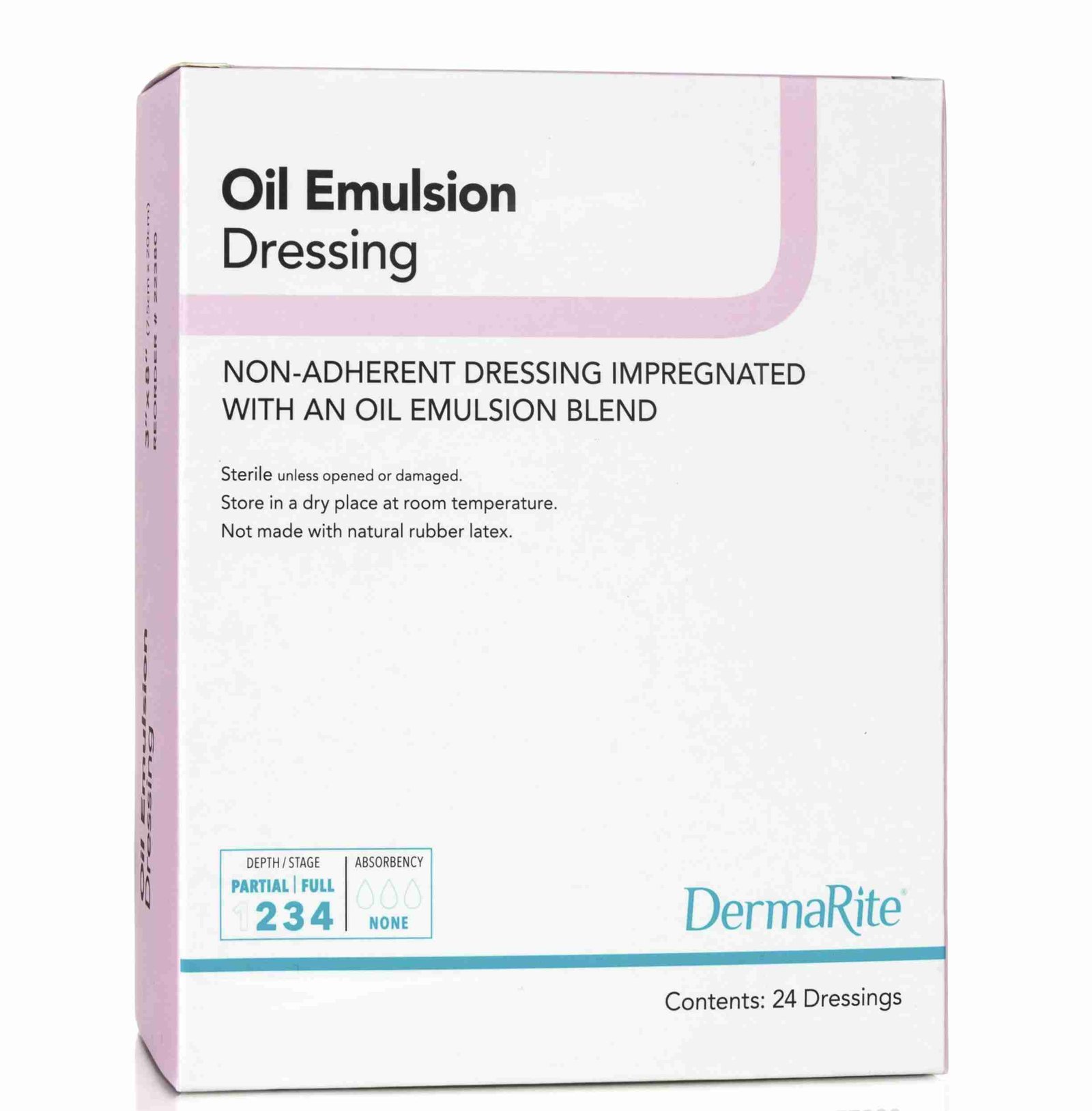 - Oil emulsion wound dressing consists of a nonadherent gauze mesh impregnated with white petrolatum in an oil emulsion blend