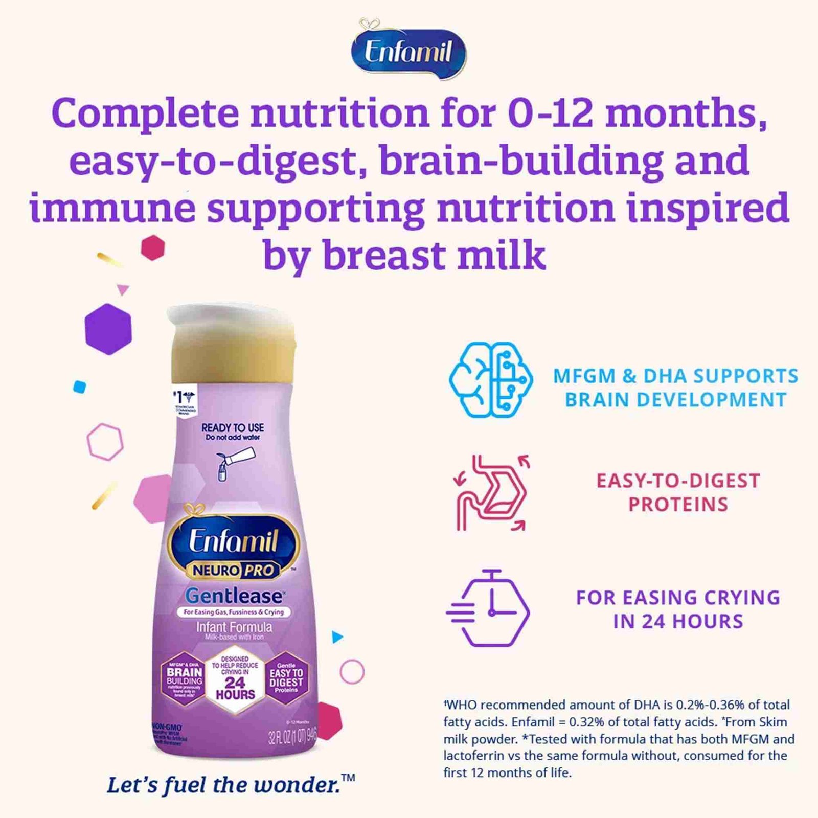 - A fat-protein blend of MFGM and DHA (docosahexaenoic acid, an omega-3 fatty acid) — brain building nutrition inspired by breast milk