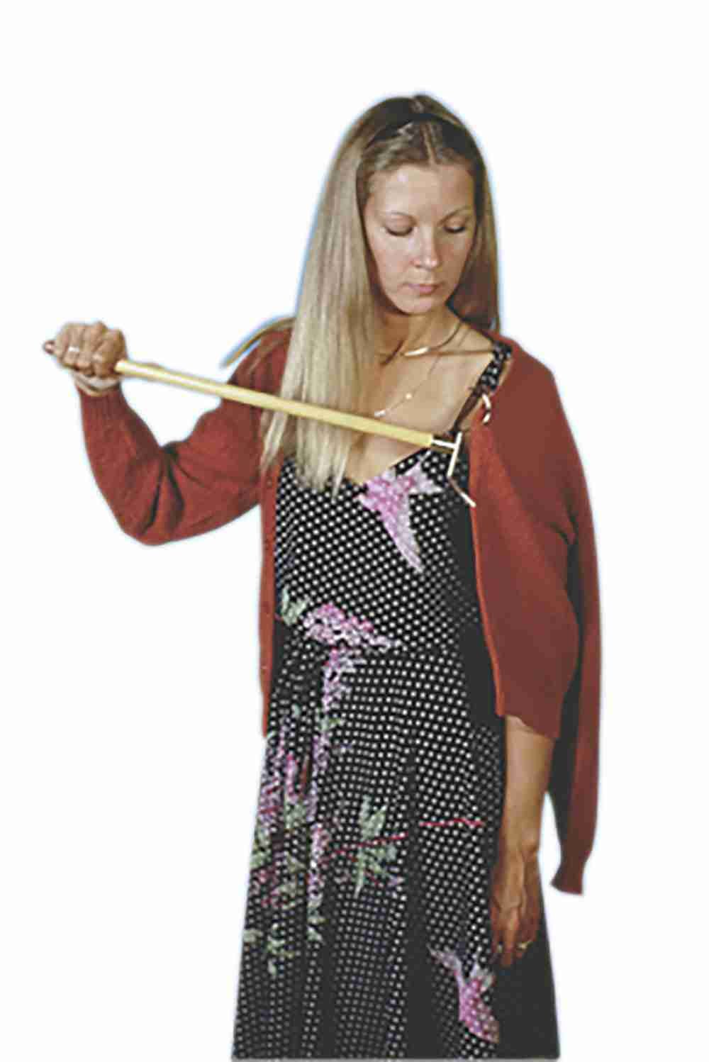 - Combination hook/pusher assists in putting on shirt and jacket, pulling up slacks, or removing socks