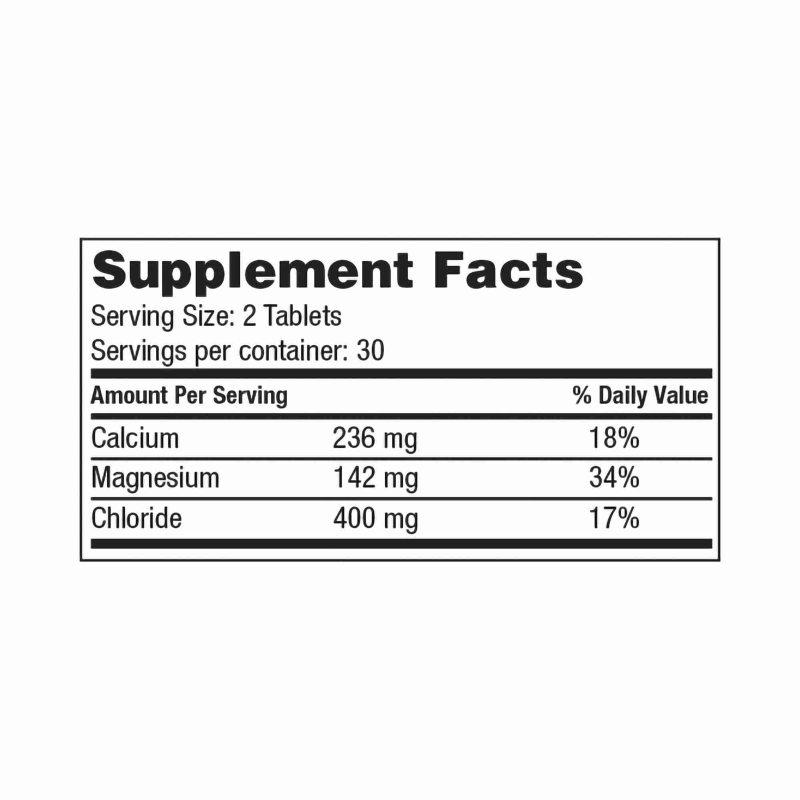 - 236 milligrams of calcium; 142 milligrams magnesium and 400 milligrams of chloride per tablet