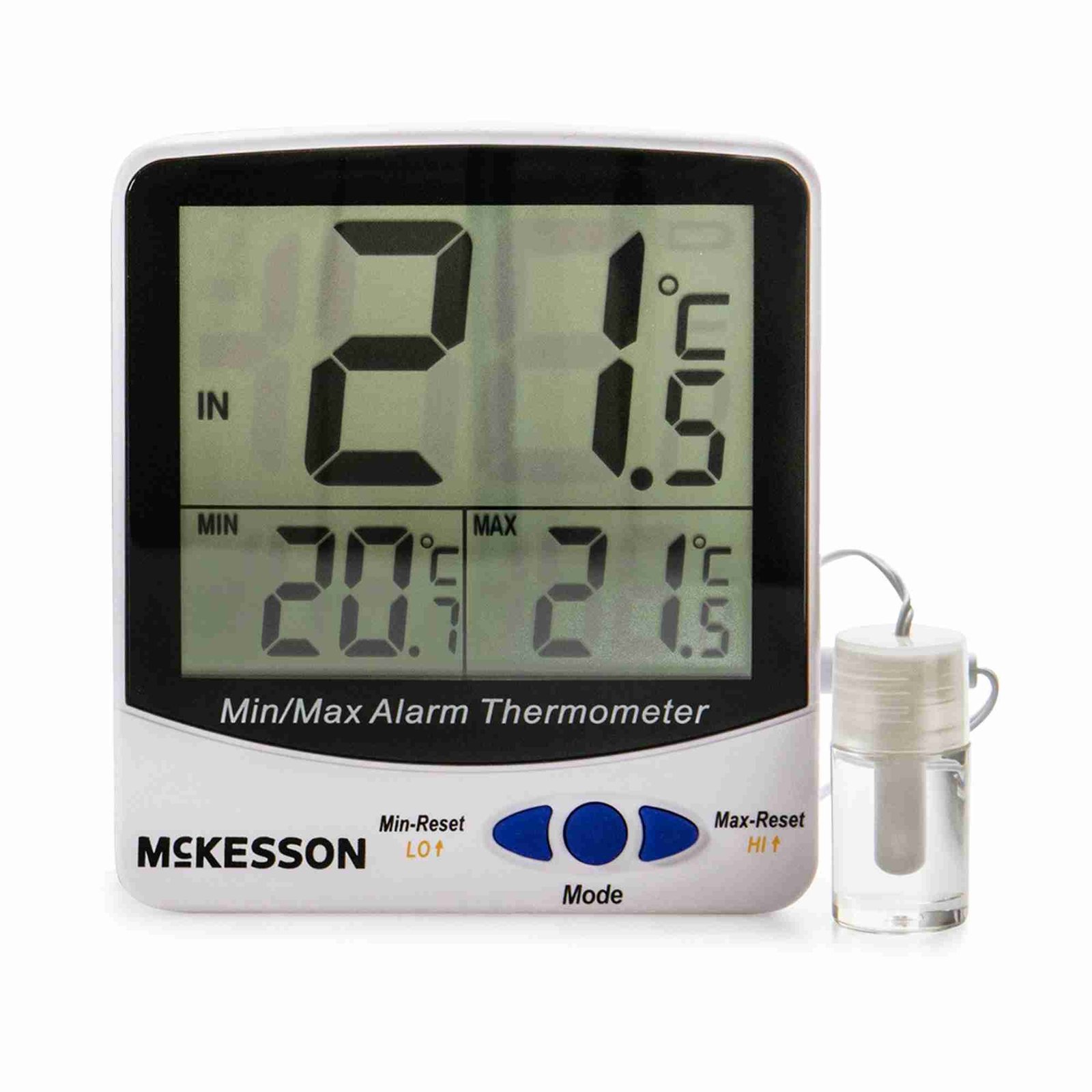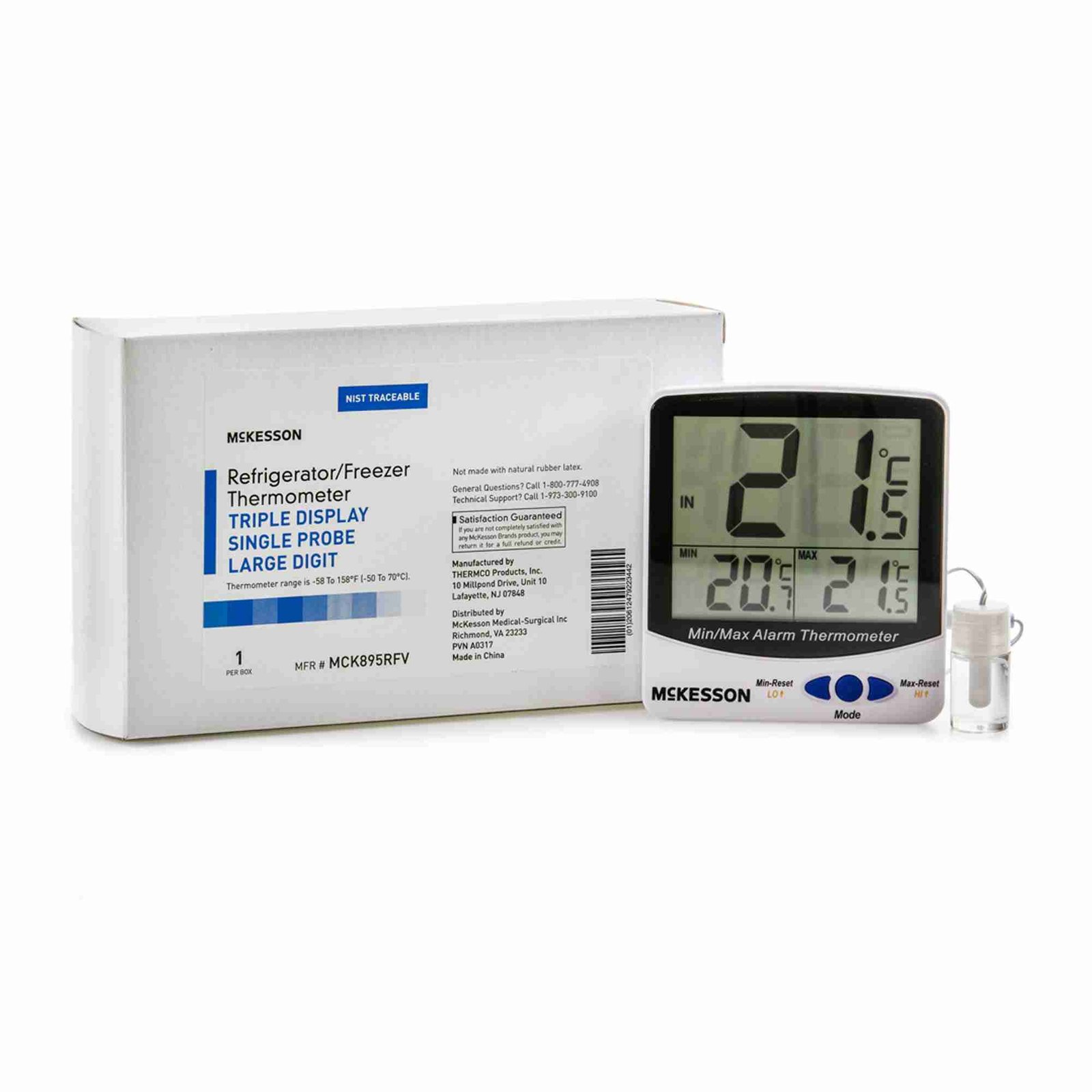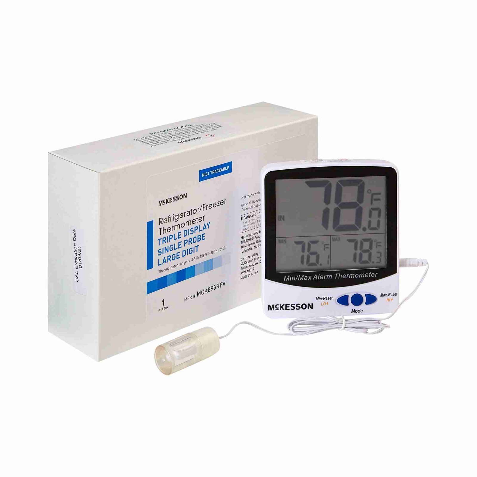 Digital Refrigerator / Freezer Thermometer with Alarm McKesson Fahrenheit / Celsius -58° to +158°F (-50° to +70°C) Glycol Bottle Probe / Internal Sensor Multiple Mounting Options Battery Operated