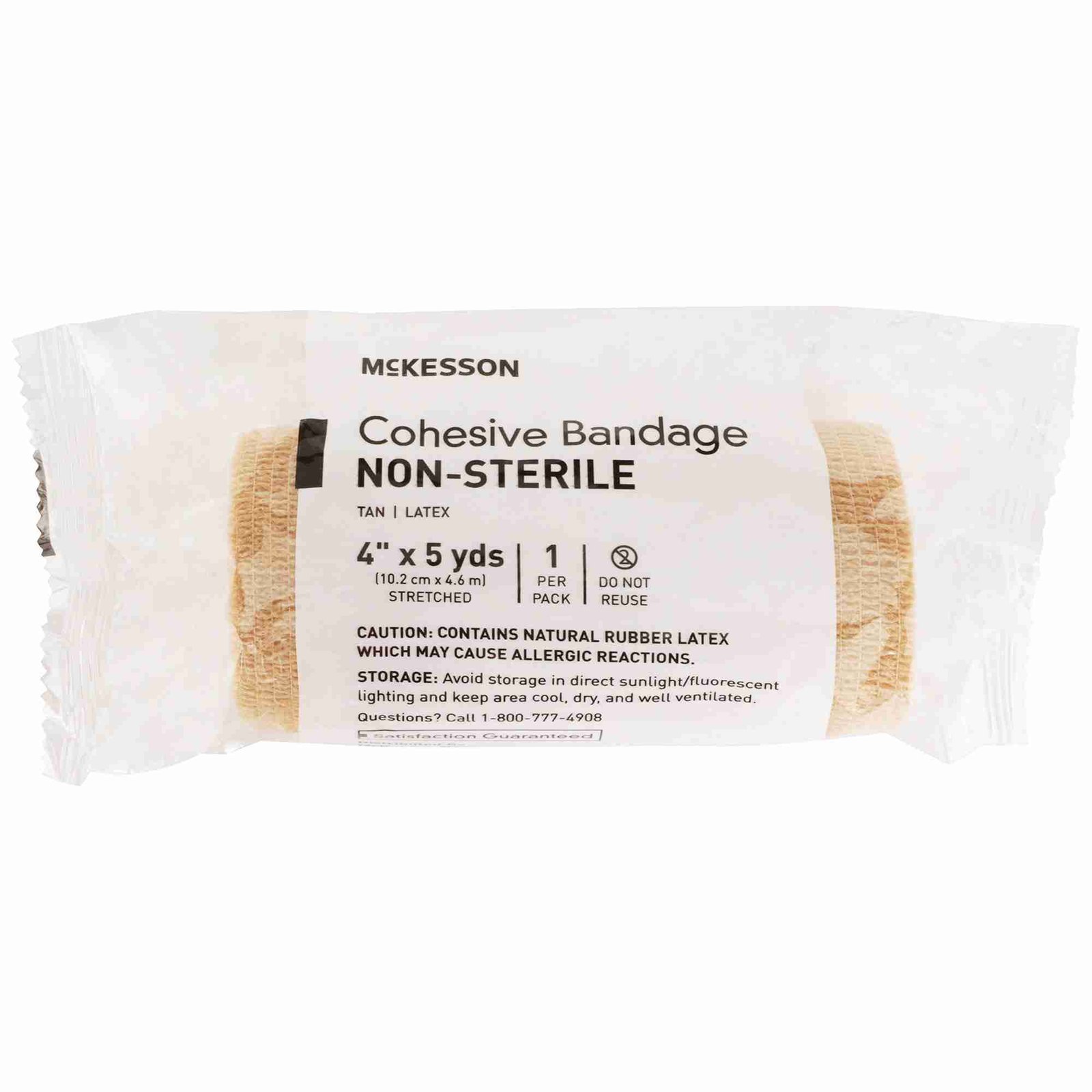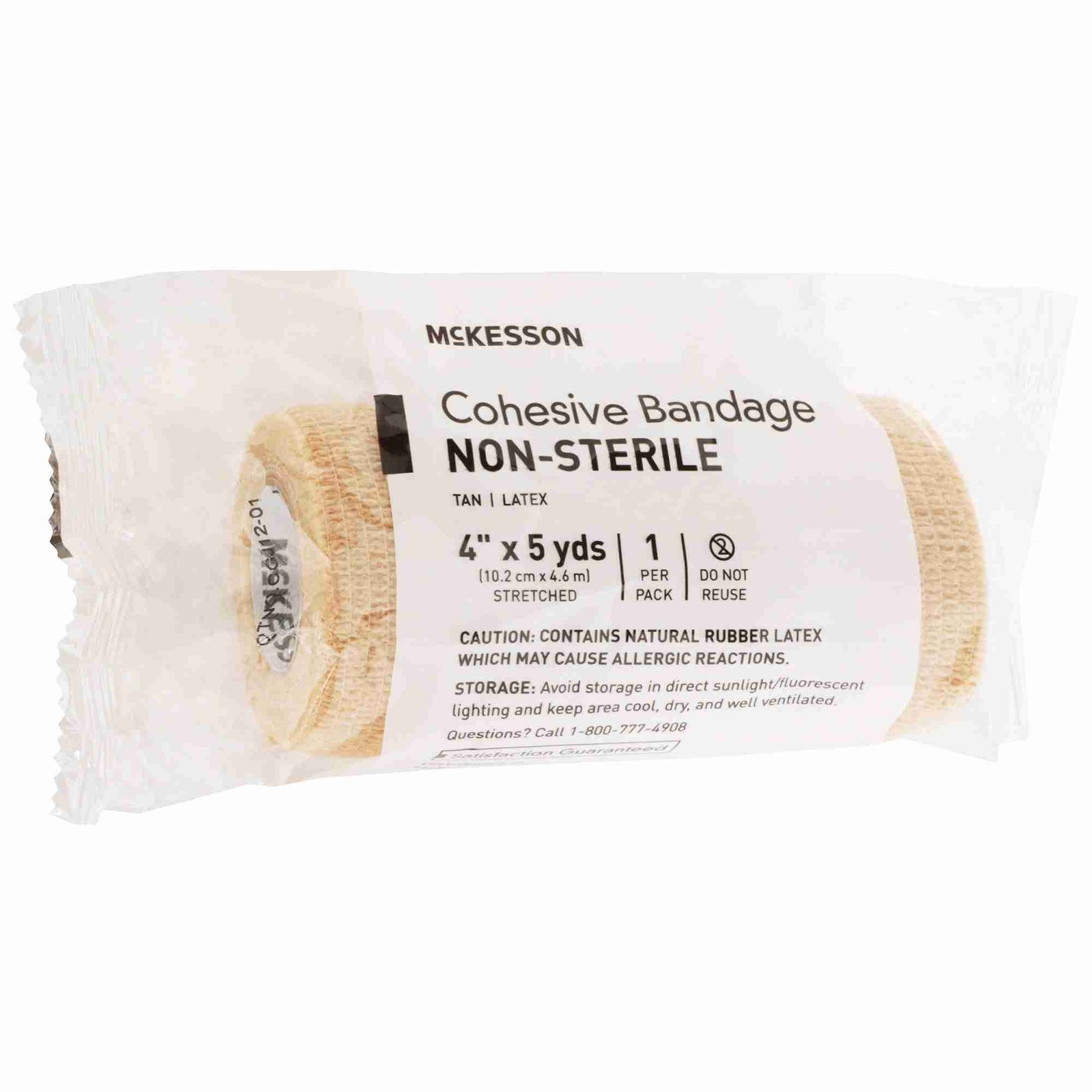 - McKesson cohesive bandages, 4 inches x 5 yards, provide standard compression, supporting sprains and strains or holding dressings in place