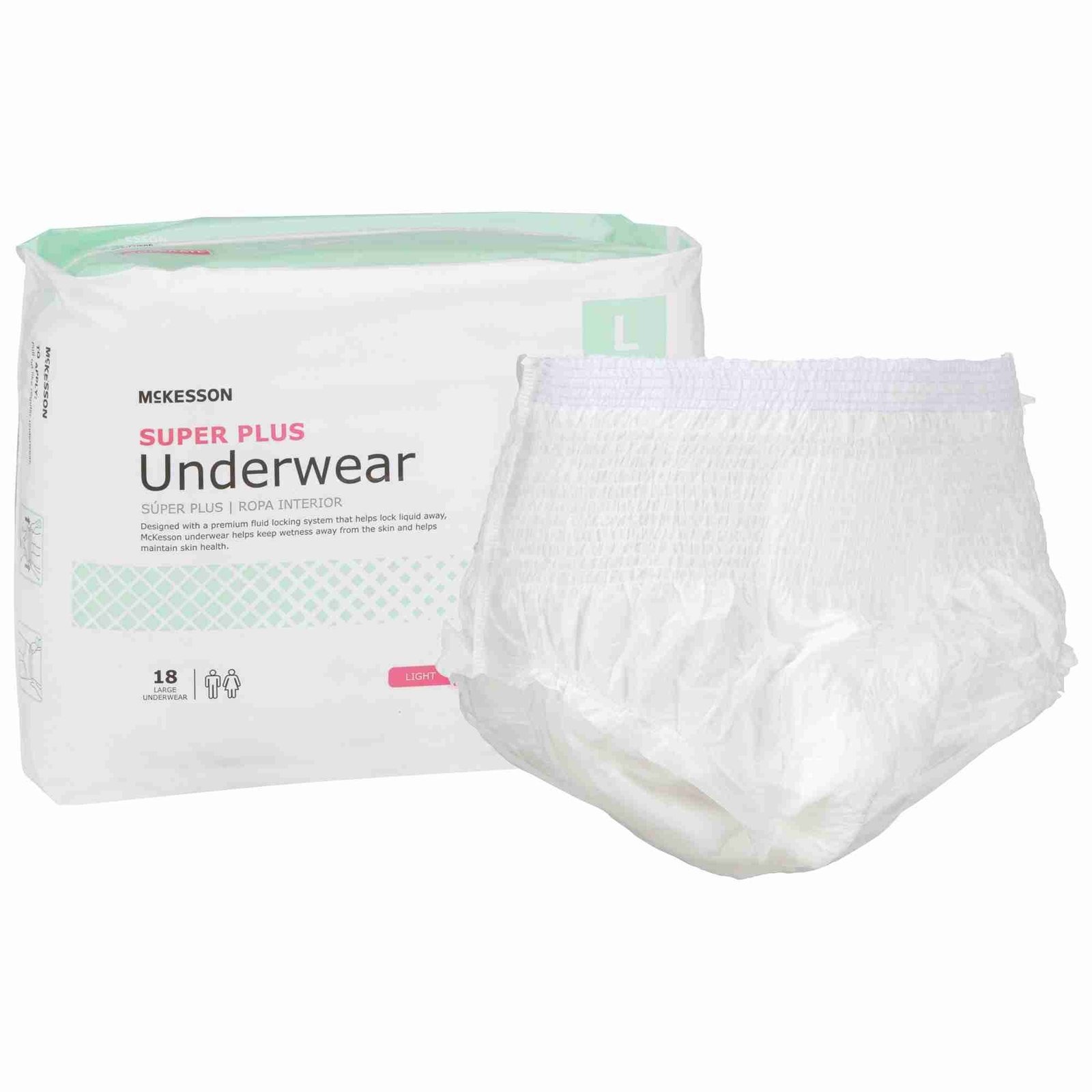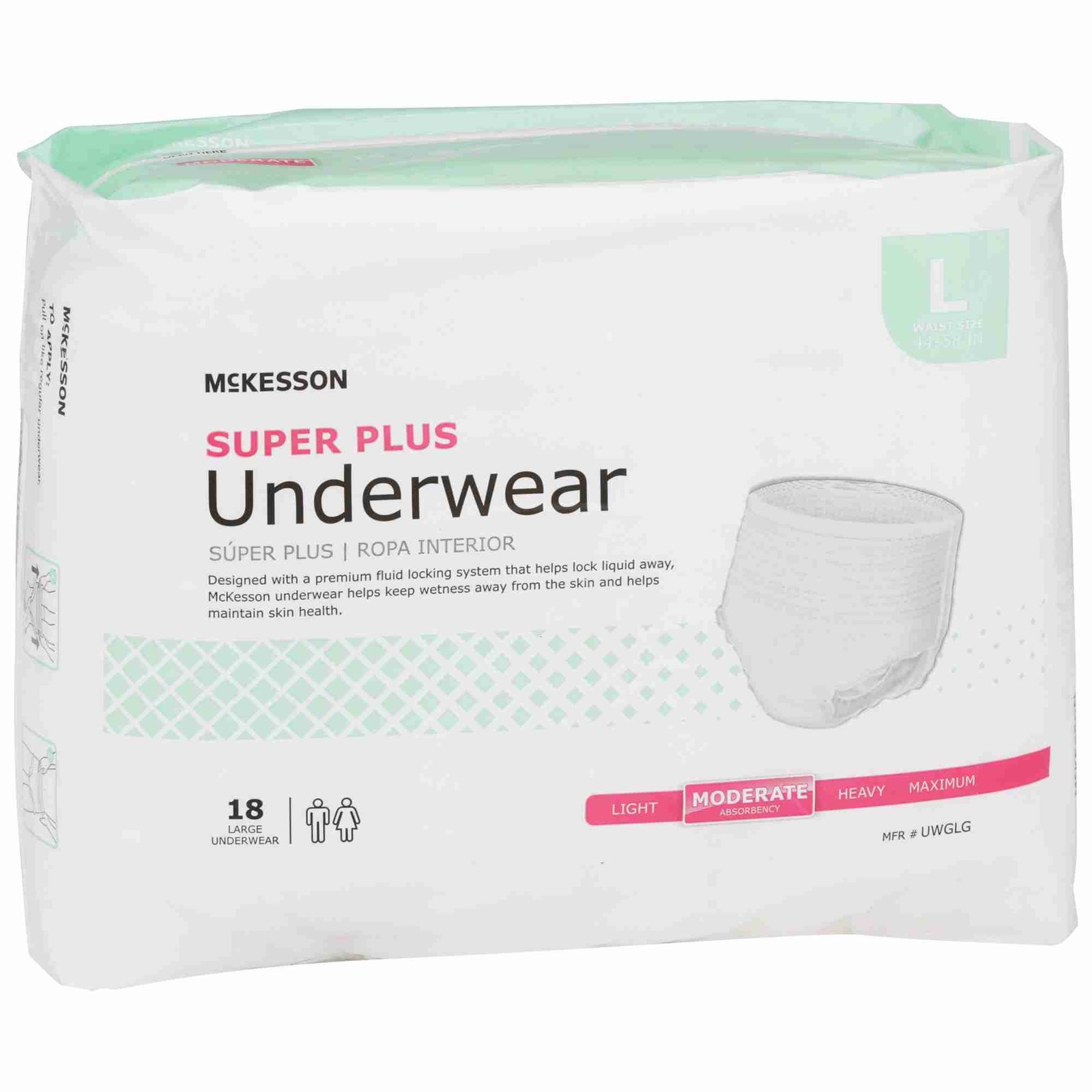 - The large McKesson Super Plus underwear accommodates adults with a waist/hip size of 44 to 58 inches