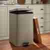 - Use this beige trash can with a plastic liner for disposal of waste material