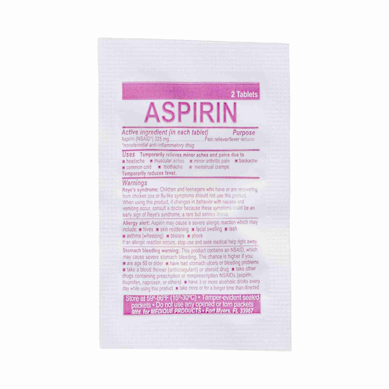 - Two aspirin tablets per packet, 50 packets per handy dispenser carton, for a total of 100 aspirin