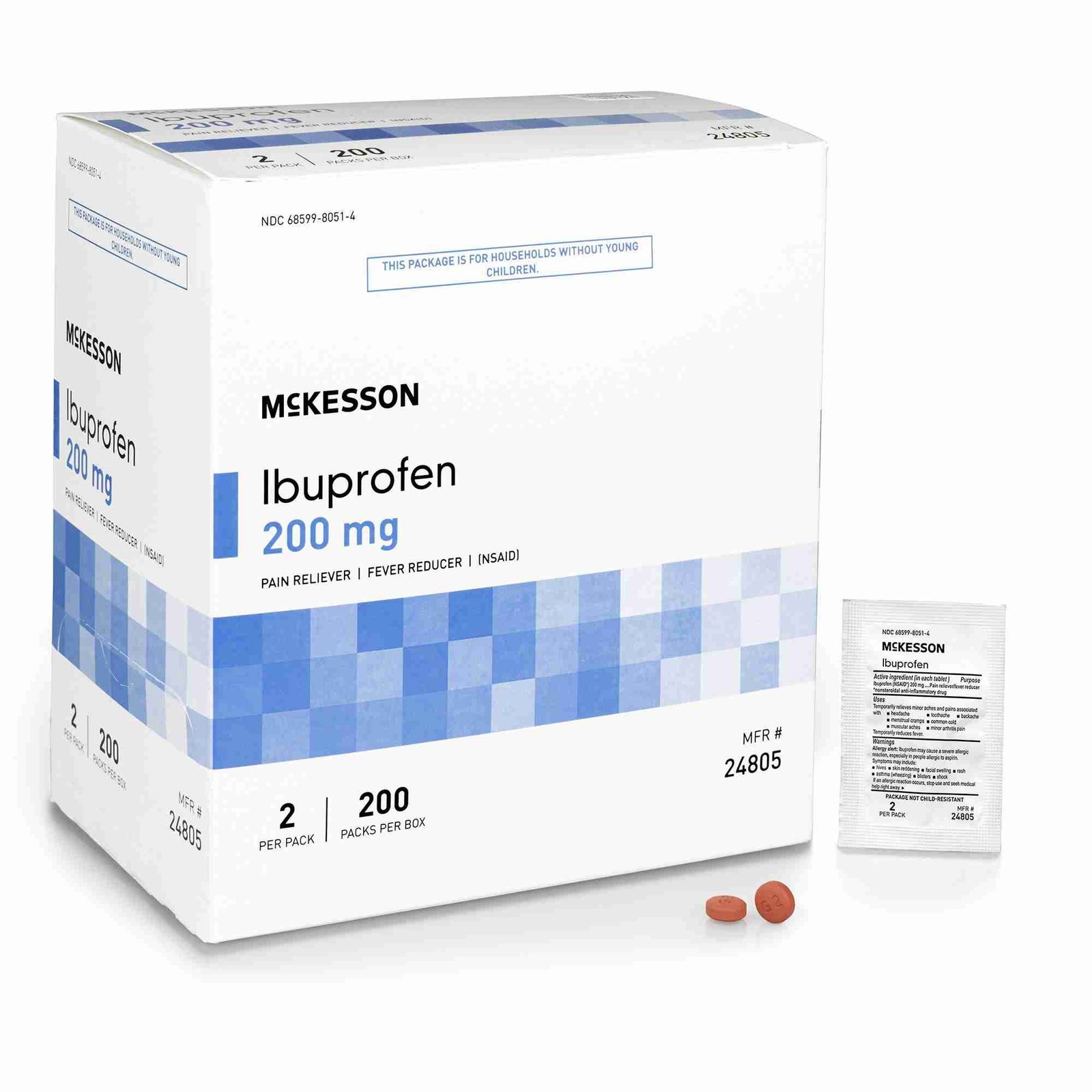 - Carton dispenses ibuprofen in packets: There are two tablets per packet and 200 packets per carton