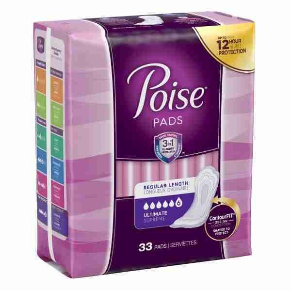 • Poise® Ultimate Absorbency pads are individually wrapped for hygienic storage and convenient travel use