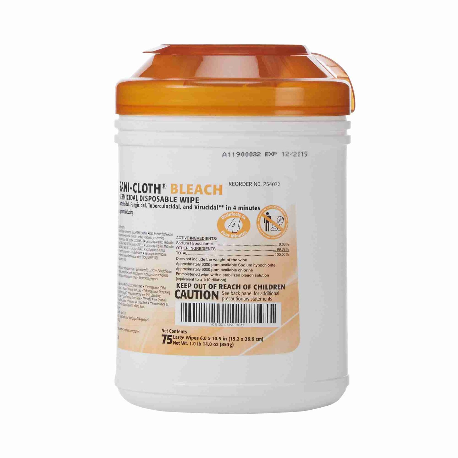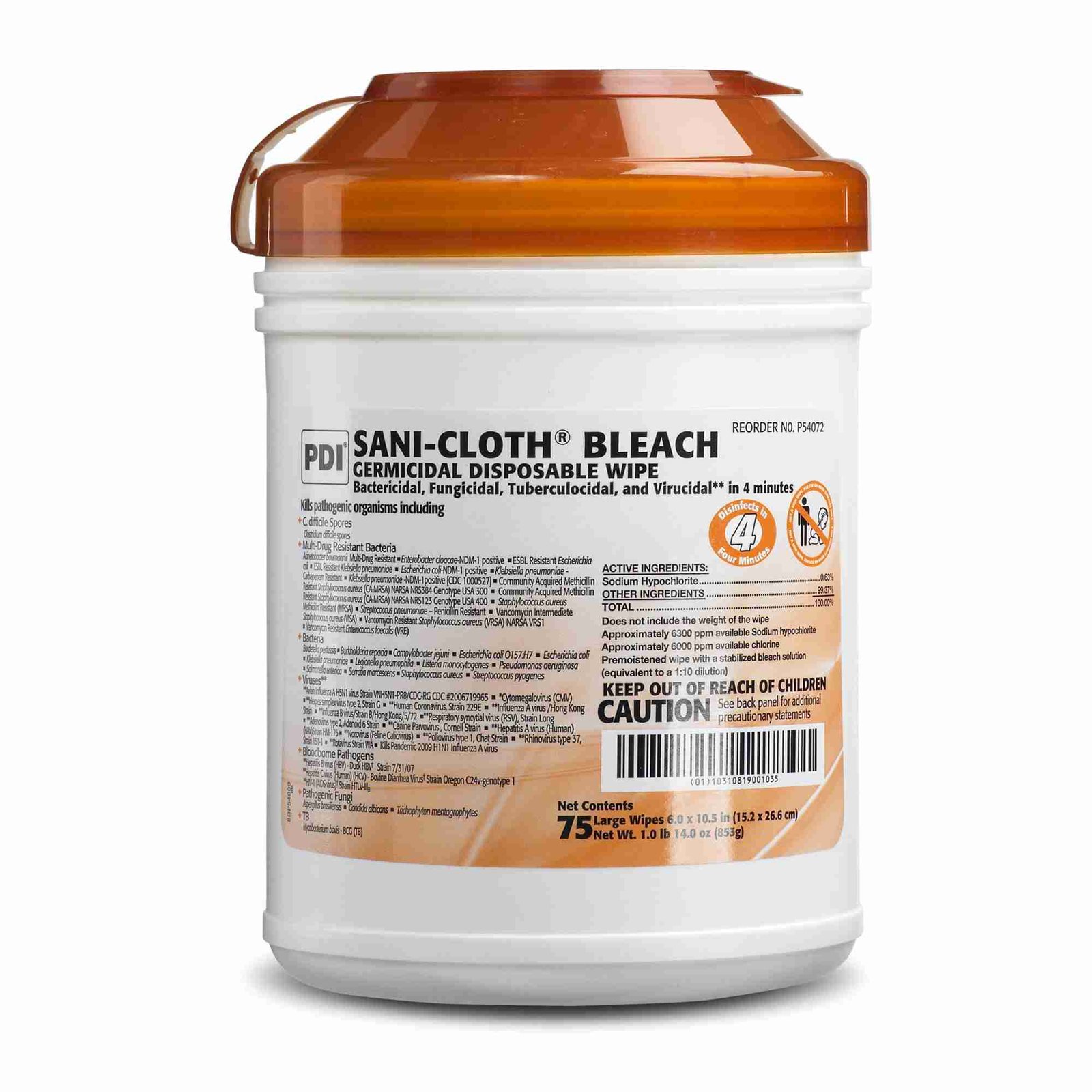 Sani-Cloth® Surface Disinfectant Cleaner Bleach Wipe, 75 Wipes per Canister