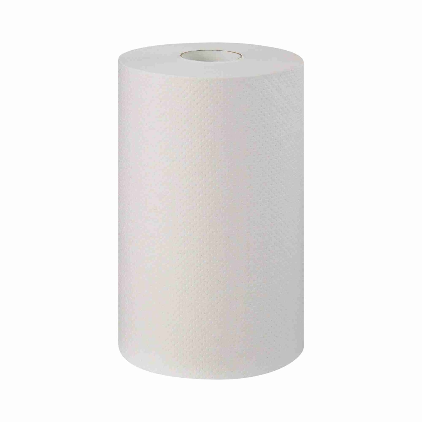 - Embossed one-ply white hard wound roll towels offer softness and absorbency