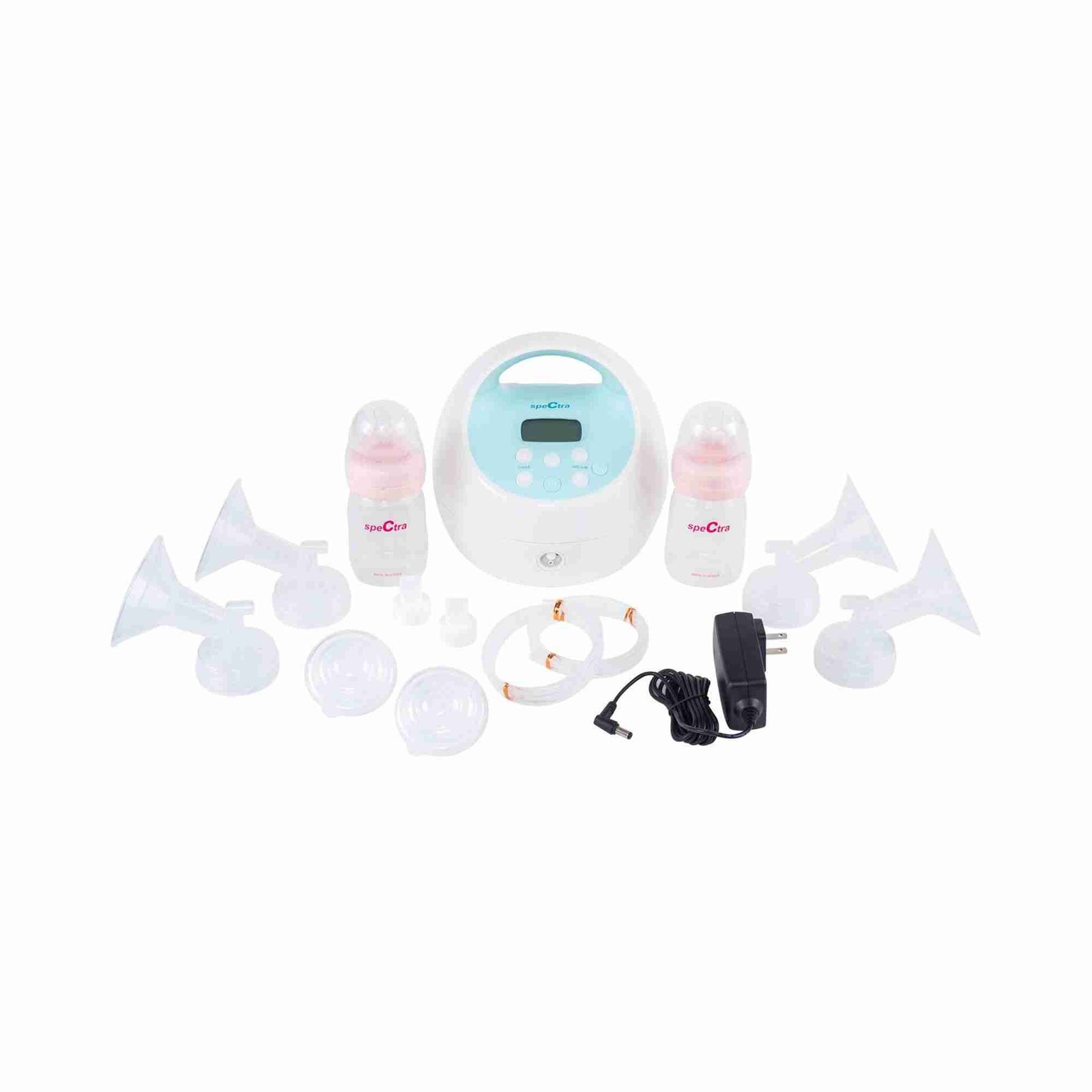 - Included are: two 24-mm Spectra breast flanges; two 28-mm Spectra breast flanges; two Spectra tubes; two Spectra duckbill valves; two Spectra backflow protectors; silicone membranes for each backflow protector; two Spectra wide neck storage bottles; includes nipple, cap, disc, and lid for each bottle; Spectra 12-volt AC power adapter
