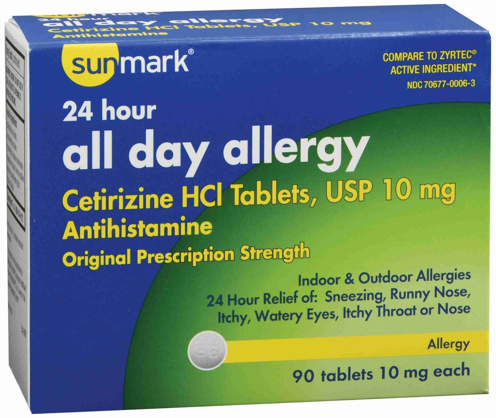 - 10 mg of cetirizine per tablet, 90 tablets per bottle