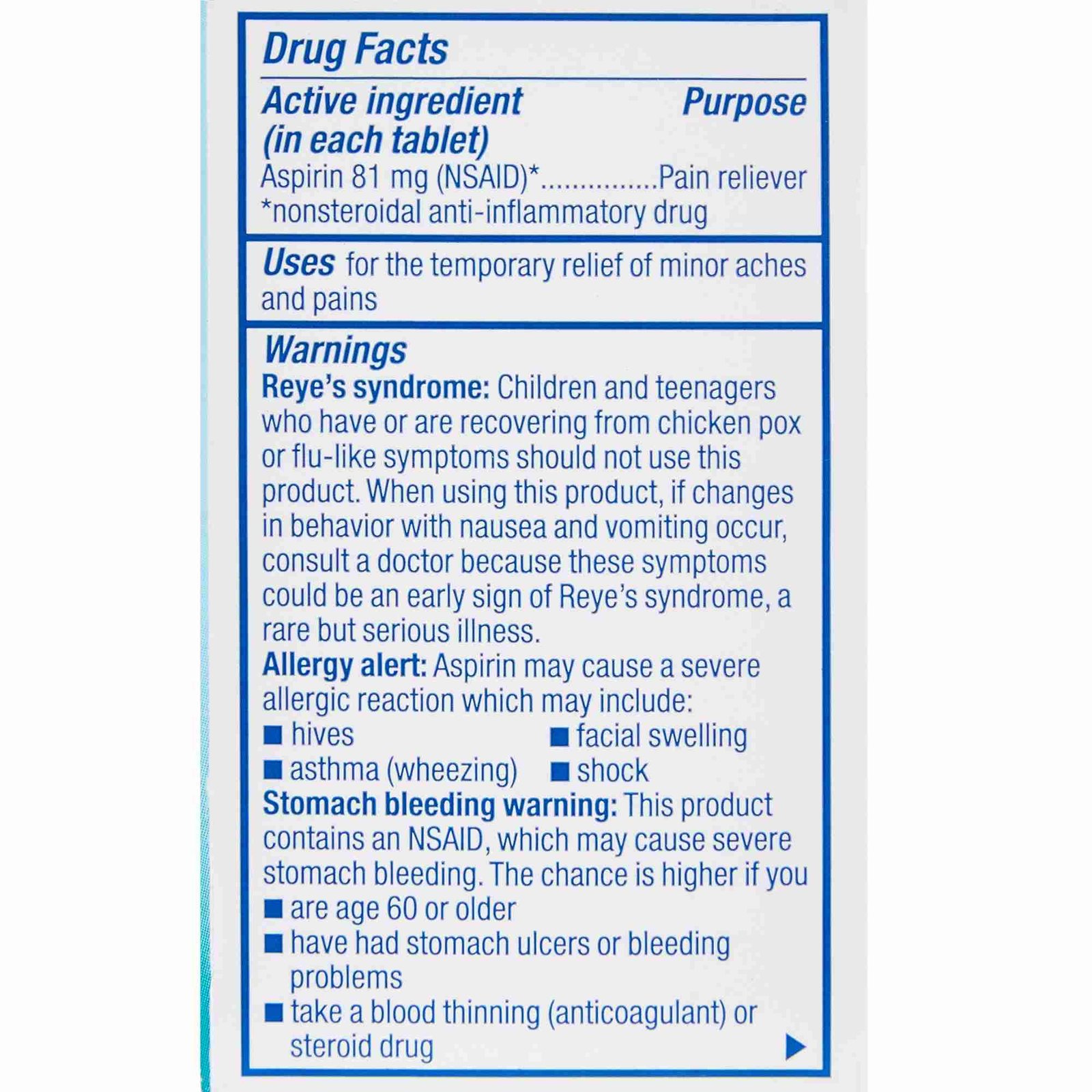 - 81 mg of aspirin per tablet