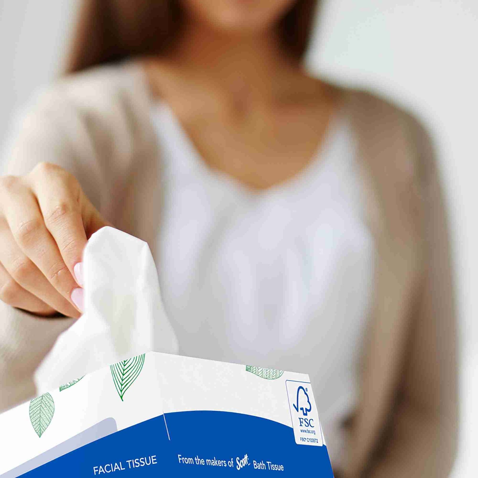 - The 2-ply facial tissue material combines durability with absorbency for thorough cleansing